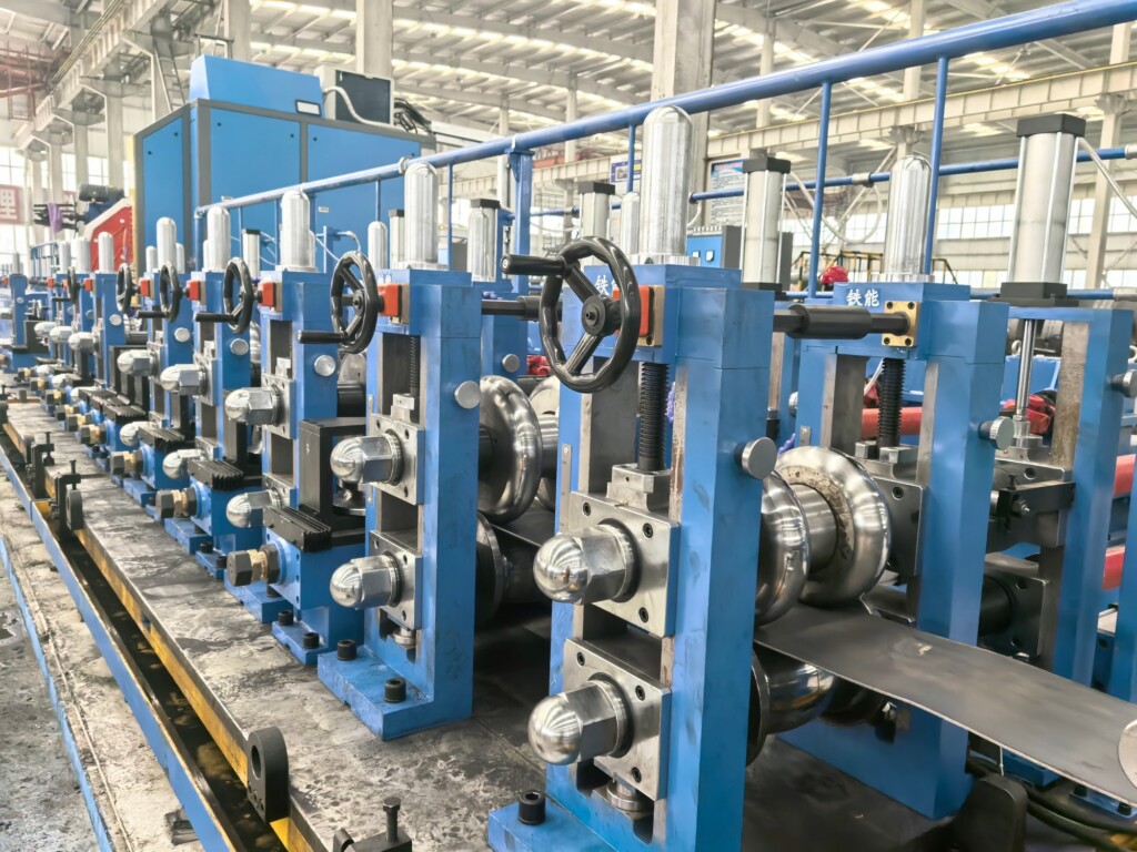 Uncoiler → shear & butt welder→ buffering → forming section → welding section→ cooling → sizing section(straightening) → online eddy current testing → cutting → blanking collection