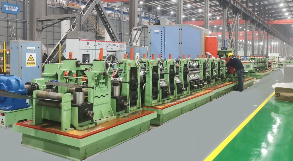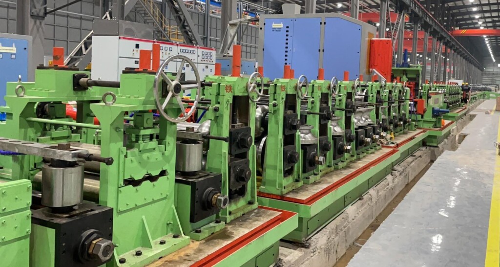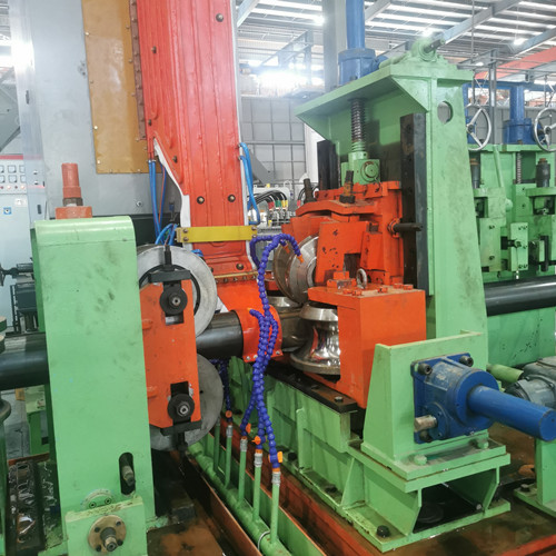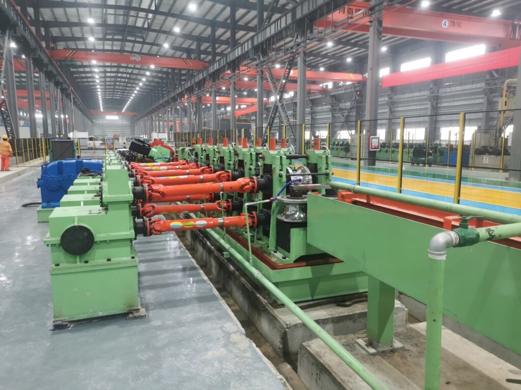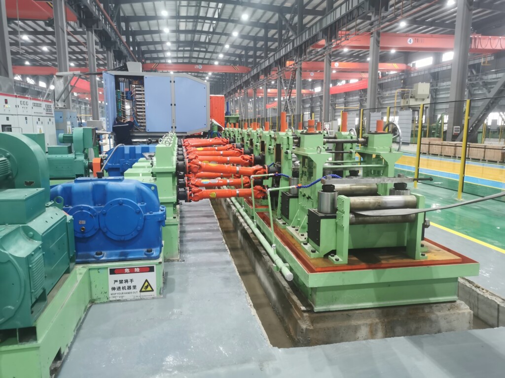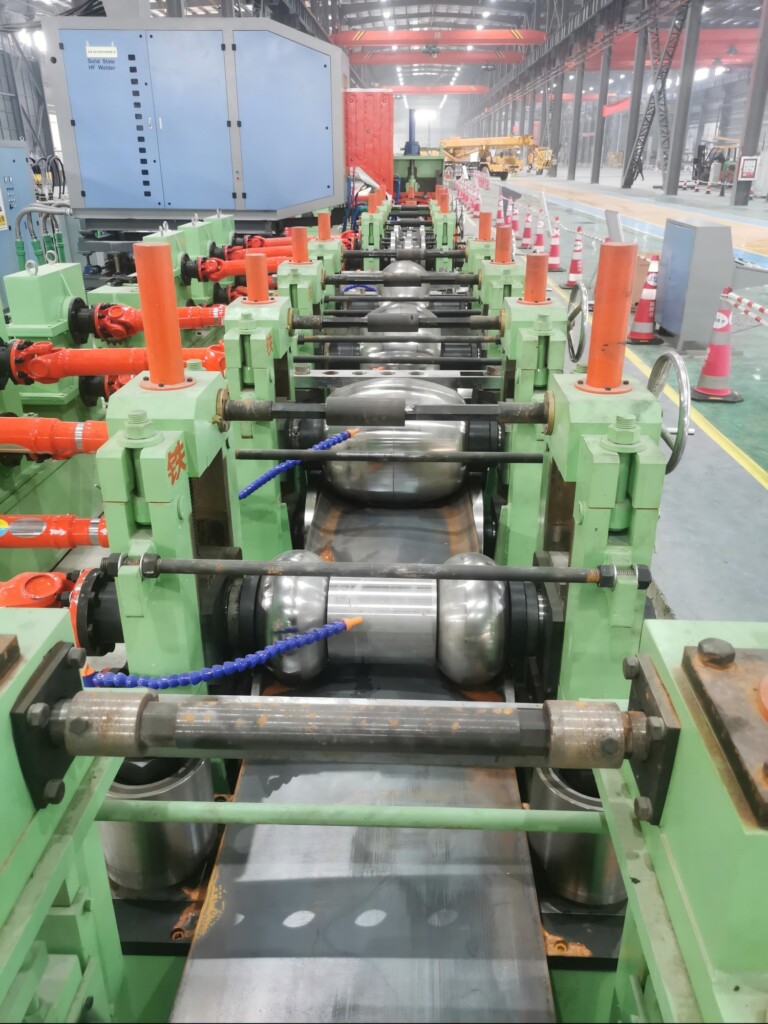 Стан предназначен для изготовления круглой трубы Φ33,4мм-Φ114,3мм толщиной 1,2мм–5,0мм из холоднокатаной и горячекатаной рулонной полосы методом незакрытой трубной заготовки с последующей ее сваркой в трубу, нагрева кромки с помощью твердотельного высокочастотного сварочного аппарата, сварки продольных швов в валках трубосварочной машины, охлаждения, дальнейшей калибровки или формовки и поточной резки бесконечной трубы на мерные длины.